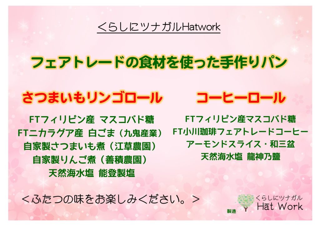 調布にある晃華学園さんは、SDGs推進の一環としてさまざまな活動に取り組まれ、イベント時にはフェアトレードの食材を使ったHātWorkのパンを販売してくださっています。