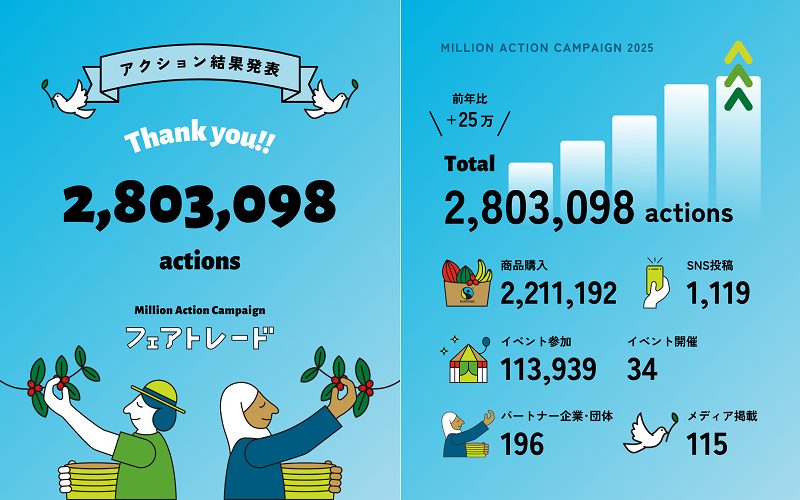 このキャンペーンは、より多くの人にフェアトレードを知り行動してもらうため、2021年から実施されているもので、「商品購入」「SNS投稿」「イベント参加」などのアクションを目指しています。今年度は300万アクションが目標です。キャンペーン期間中に、日本全国でフェアトレードに関するアクションを行うと、協賛企業から1アクションにつき1円が途上国の生産者へ寄付されます。