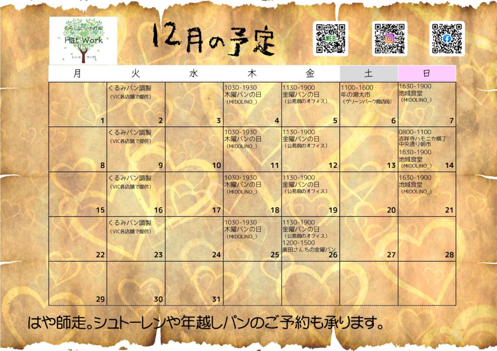 12月の予定です。なんだかあっという間に師走です。年の瀬ということで、グリーンパーク商店街の年の瀬市が6日に。廣田さんちの金曜パンは26日となります。この日が今年の年納めとなります。シュトーレンや年越しパンのご予約も承ります。