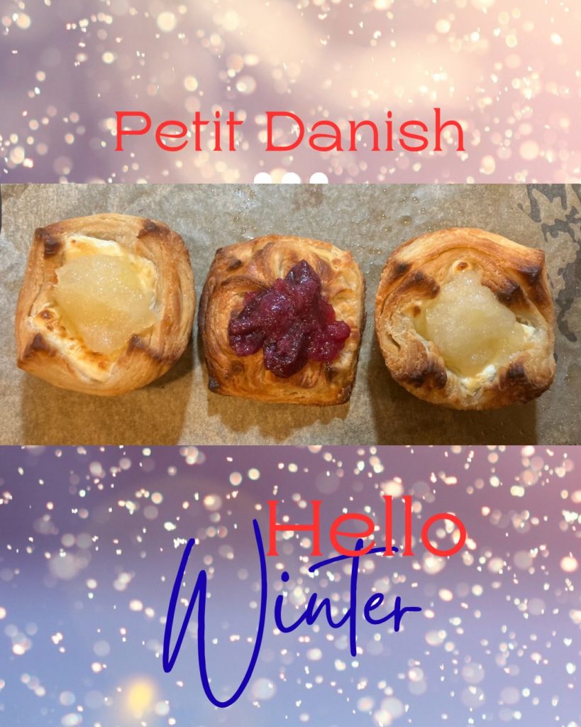 12月に入り年末に似合う少し華やかなプチデニッシュなどもご用意しています。リンゴとカスタード、あんことバター、柿とクリームチーズの三種類です。数量限定ですのでご予約をおすすめします。先週末にお出ししたシュトーレンも予約、販売します。