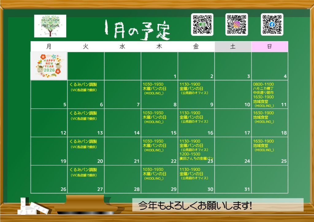 本年もよろしくお願いします。1月の予定です。本格始動は第2週からとなります。廣田さんちの金曜パンは23日となります。