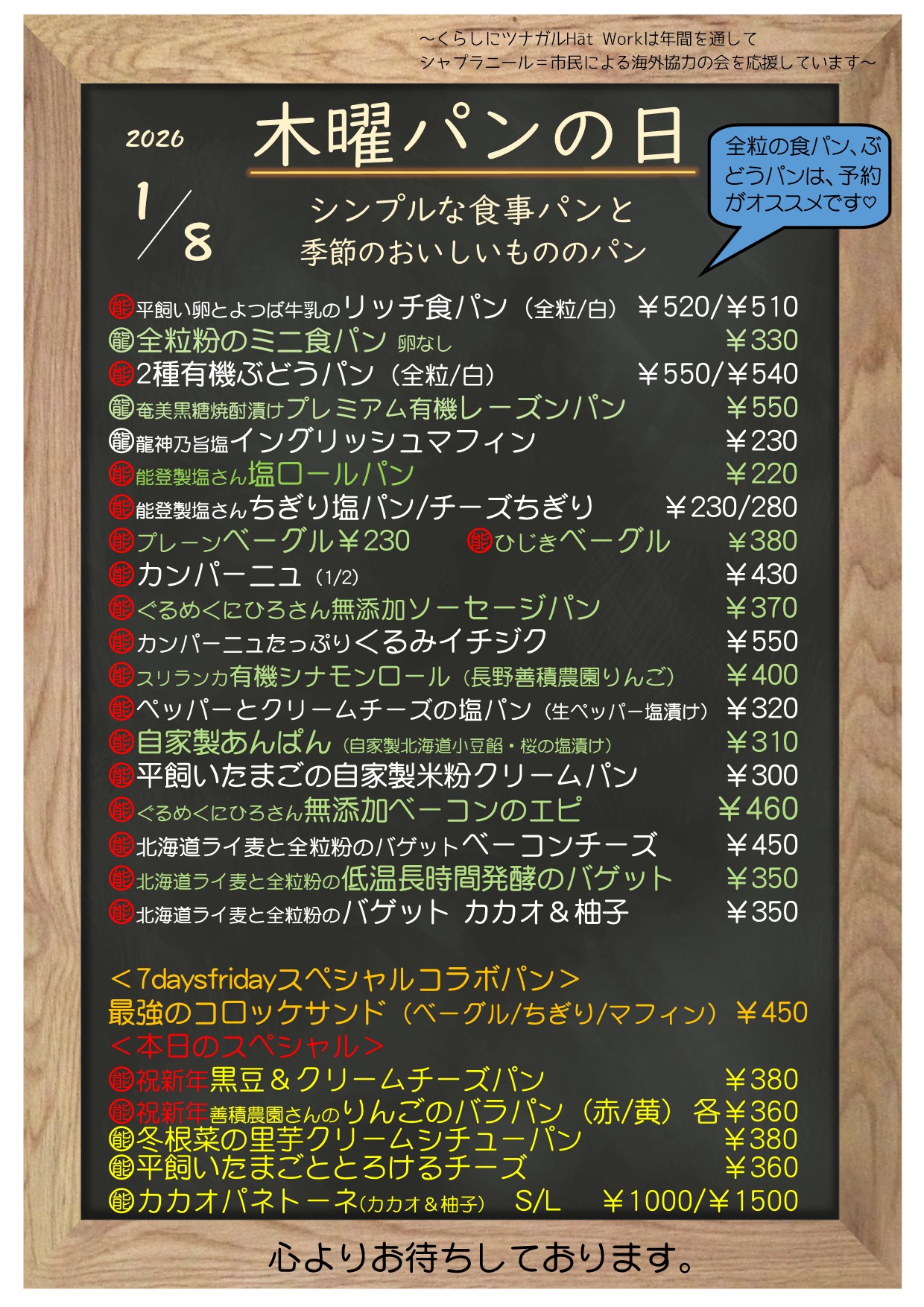 新年のお祝いパン、いつもの塩ロール・あんぱん・クリームパン、プレミアムレーズンパンなどお持ちします。こだわり食材、フェアトレード雑貨もどうぞお楽しみに。