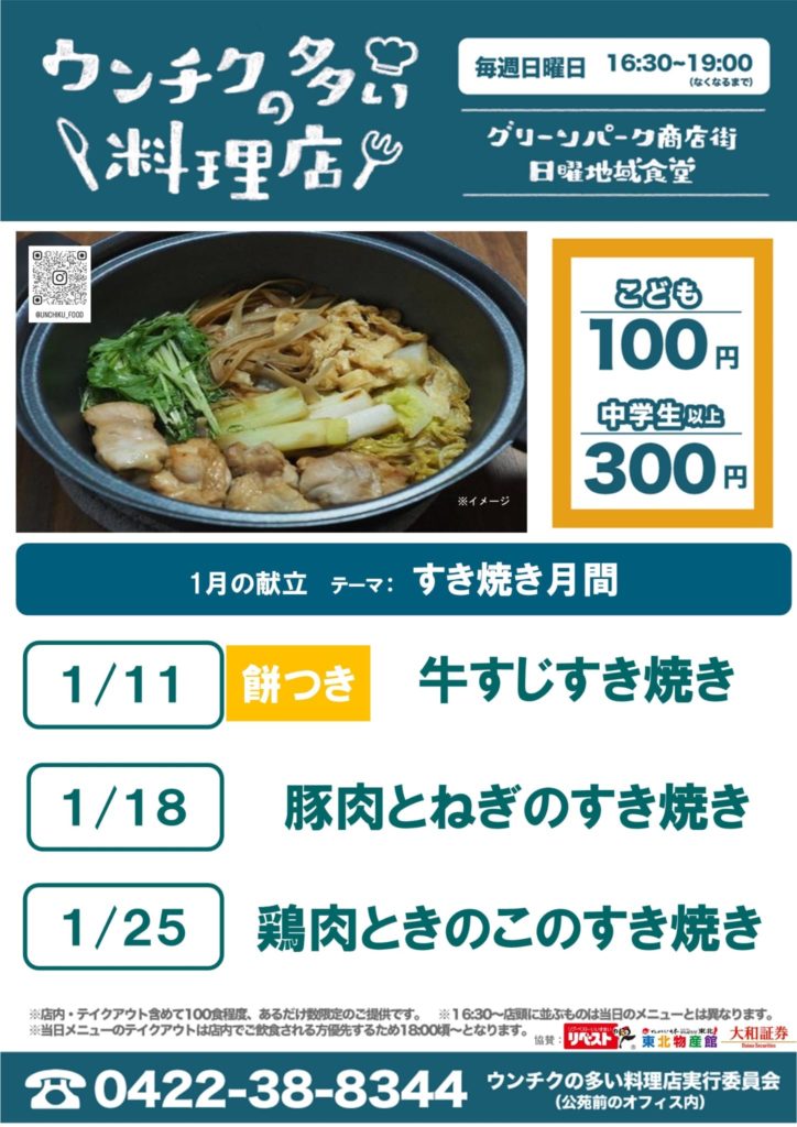 1月のテーマは、なんと!「すき焼き」11日は「牛すじすき焼き」です。