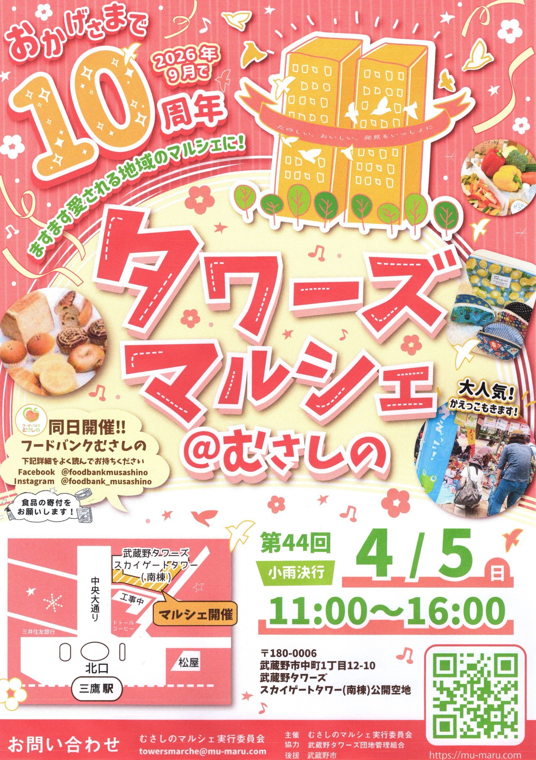 HatWorkが初回から実行委員としてかかわっている三鷹駅北口の武蔵野タワーズのオープンスペースで年に5回程度開催されているマルシェです。2016年に開始して今年で10周年を迎えます。